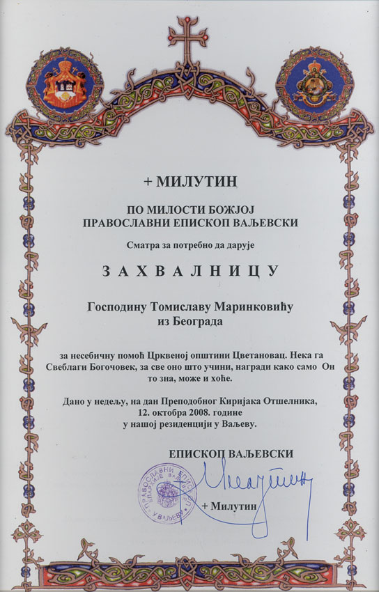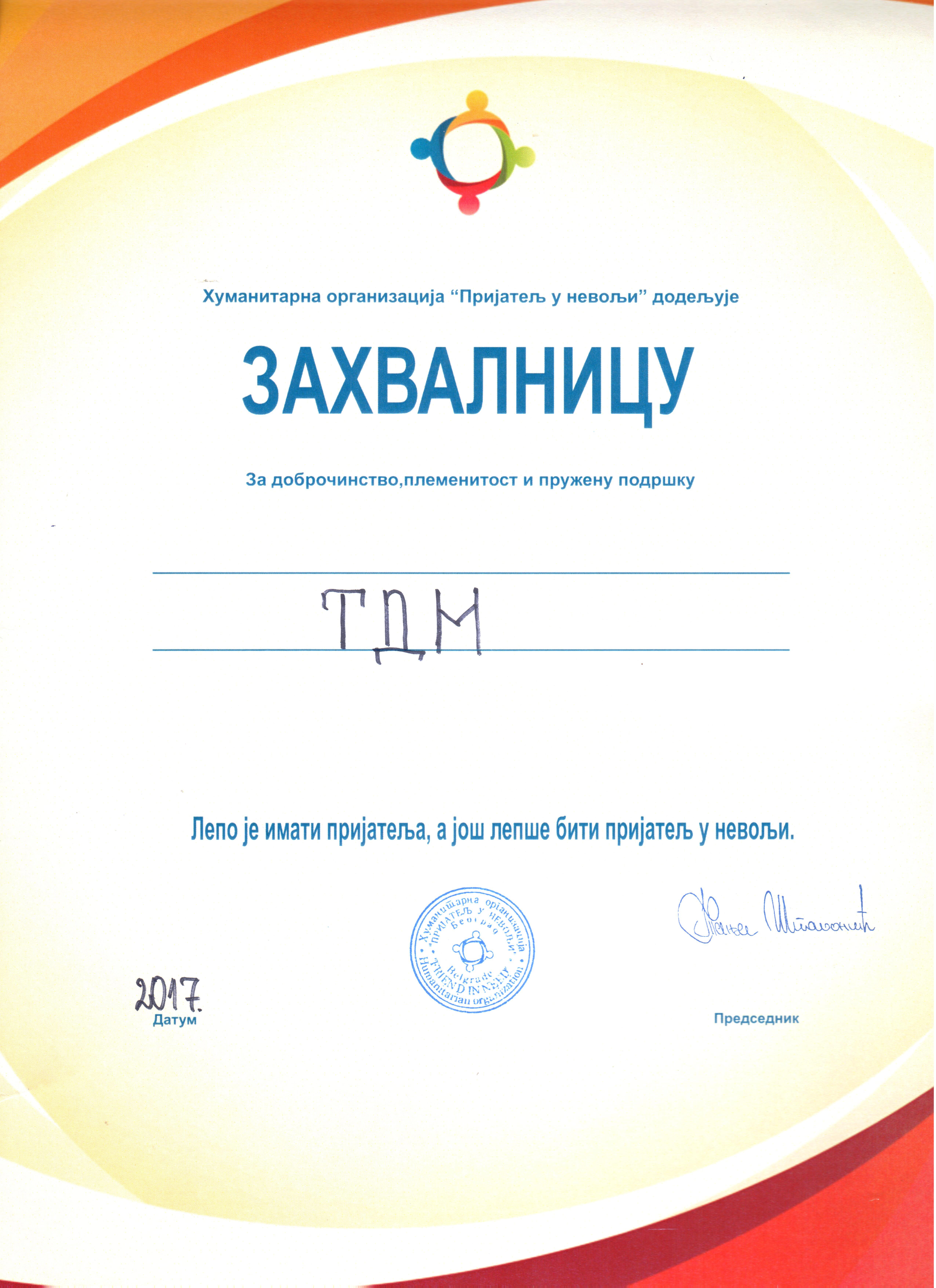 TDM je dobio zahvalnicu od Beogradskih elektrana za doprinos stvaranju modernog i efikasnog preduzeća, a takođe i za pomoć u rekonstrukciji crkve Sabor svetog arhangela Gavrila u opštini Ljig od Episkopa valjevskog Milutina.